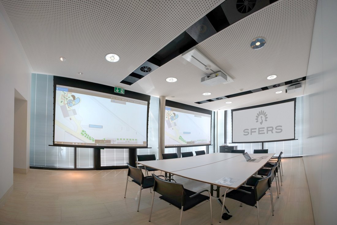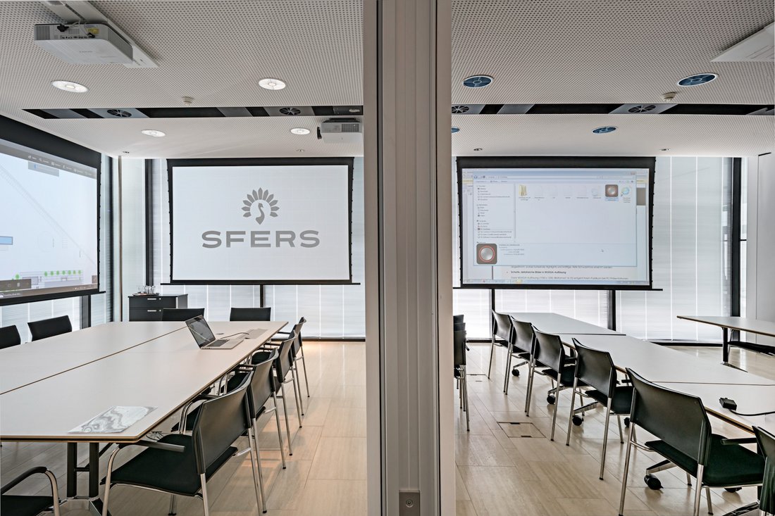 Die wartungsarmen Sony Laser Projektoren konnten trotz grösseren Projektionsflächen mit wesentlich mehr Lichtleistung hellere und kontrastreichere Projektionen realisieren. Die Betriebskosten sind dank Lasertechnik statt Lampen und selbstreinigenden Lüfter minimal. Je nach Anlass können aus einem Raum bis drei Räume generiert werden. Und dies mit einem Knopfdruck. Dafür sorgt die AMX Mediensteuerung. Nun sind die Konferenzen nicht nur informativ, sondern machen auch Spass.