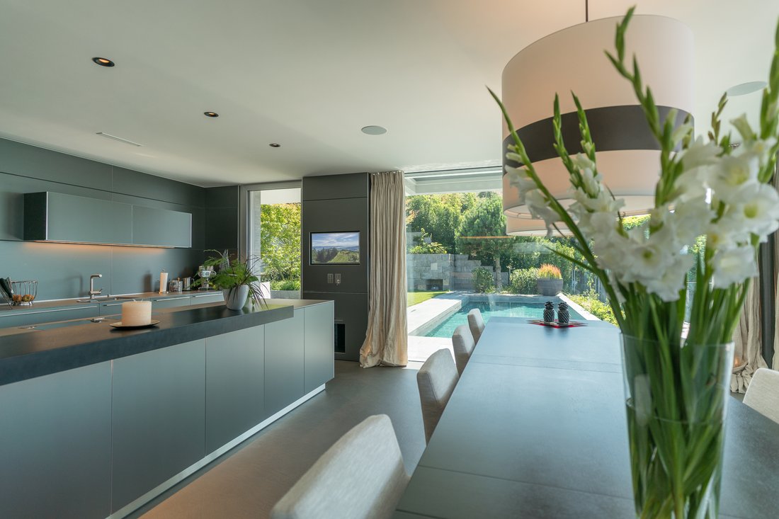zeigt sich erst nach Bedarf. Auch das Audio-Mehrraumsystem lässt keine Wünsche offen. Montiert wurden die Wandbedienungen putzbündig analog zu den Lichttastern, die Lautsprecher selbst finden sich in tonnenschweren Mauersteinen. Ein Genuss für alle Sinne.