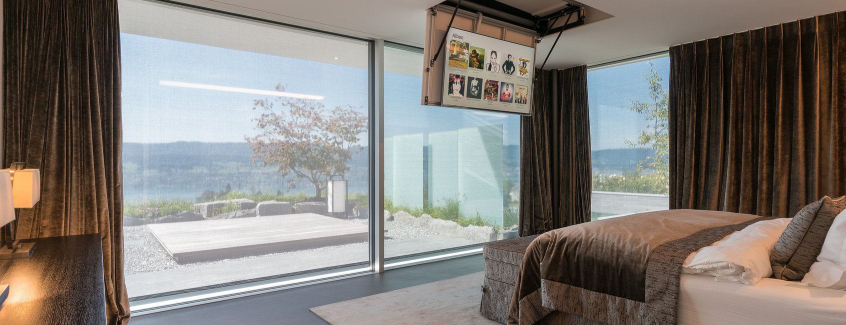 Geht nicht, gibts nicht. Nach diesem Motto führte SFERS alle audiovisuellen Installationen aus. Der TV im Schlafzimmer verbirgt sich hinter einem Deckenlift und fährt auf Knopfdruck herunter, schaltet die gewünschte Quelle ein und los geht das Filmvergnügen. Oder das Fernsehgerät verbirgt sich hinter einem Spiegel und