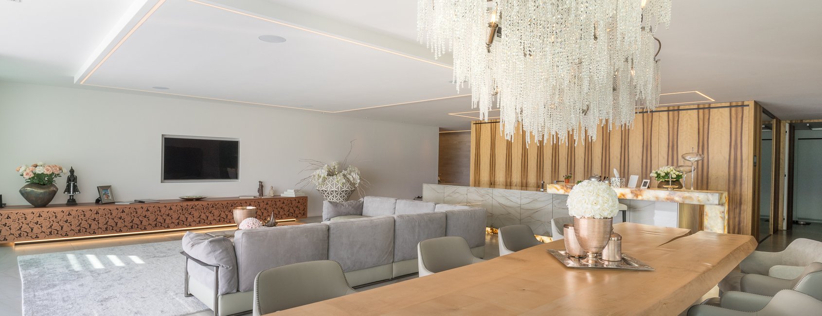 Wohin man auch blickt: Die Wohnung soll ein einziger, hochwertiger «Hingucker» werden. Darum hat SFERS alle technischen Lösungen von der Planung an bis ins Detail perfektioniert. Zum Beispiel mit individuellen Designmöbeln, die zugleich Technikzentralen und Klangkörper sind. Oder mit einer TV-Integration, die so