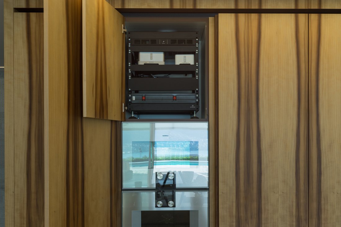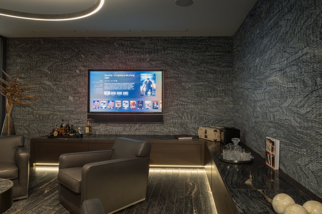 Wohin man auch blickt: Die Wohnung soll ein einziger, hochwertiger «Hingucker» werden. Darum hat SFERS alle technischen Lösungen von der Planung an bis ins Detail perfektioniert. Zum Beispiel mit individuellen Designmöbeln, die zugleich Technikzentralen und Klangkörper sind. Oder mit einer TV-Integration, die so schön gelungen ist, dass man den Fernseher gar nicht mehr einschalten möchte. Bedient wird das Ganze kinderleicht über eine smarte Fernbedienung oder die App auf dem Smartphone. Die meisten Lautsprecher sind gänzlich unsichtbar integriert, bieten aber dennoch hervorragenden Background-Sound.