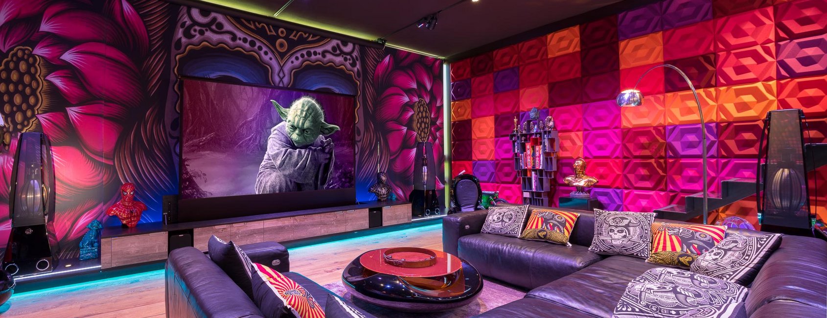 Hier gibt es selbst dann viel zu sehen, wenn im Kino nichts läuft. Der Eigner mag es bunt und ausgefallen. Also installierten wir neben High-End-Lautsprechern und Endstufen von MBL auch einen 18-Zoll-Subwoofer.