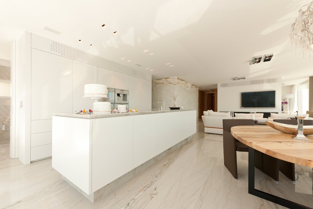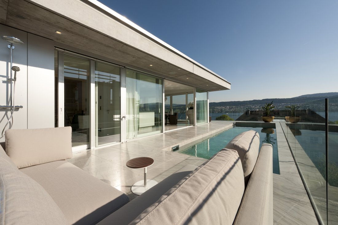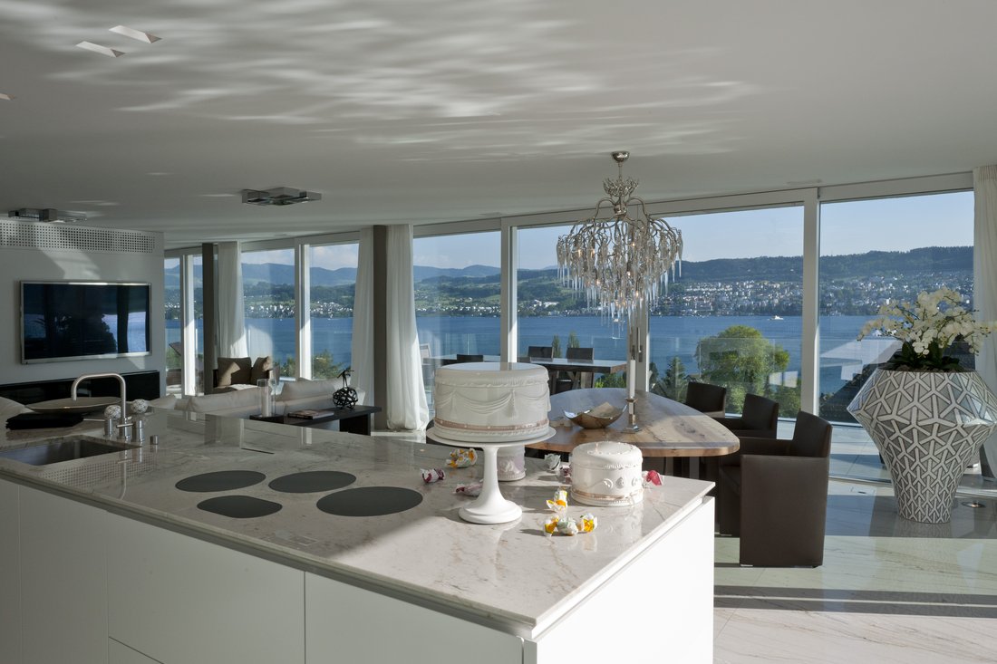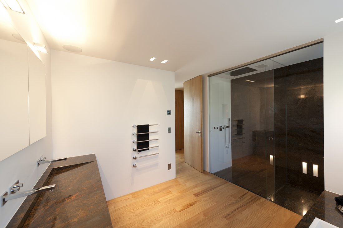 Eigentlich wollte der Immobilieninvestor die Wohnung mit einem High-End-Ausbau verkaufen, zog aber selber ein. Wer weiss, vielleicht auch wegen den putzbündig verbauten Chromstahltastern von Eclettis, mit der sich Beleuchtung und Beschattung steuern lassen.
