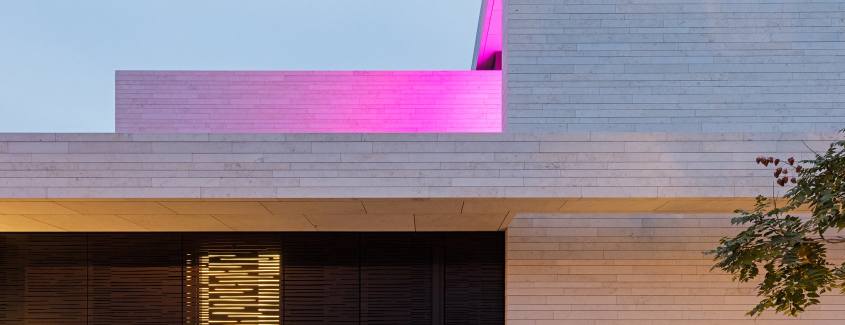 Dazu kommt eine Kunstbeleuchtung mit über 80 Kacheln an einer 40 m2 grossen Wand, mit der sich Millionen von Farbmischungen wählen lassen. Für eine einfache Bedienung kann die Bauherrschaft nun vier favorisierte Lichtstimmungen per Knopfdruck abrufen.
