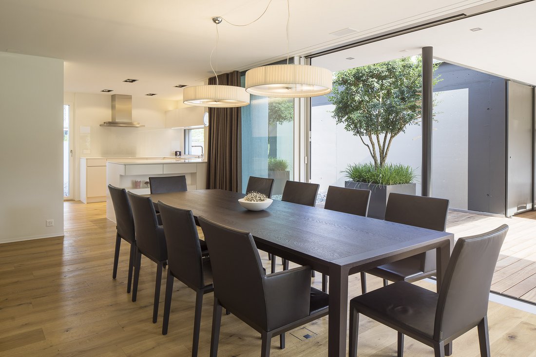 Alle Bewohnenden werden von der Haussteuerung unterstützt – dort, wo es am sinnvollsten ist und am meisten genutzt wird. Zum Beispiel im Wohn-/Ess- und Kochbereich, wo statt rund 20 Tasten für Licht und